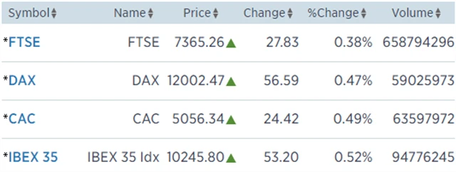 Regionální index STOXX Europe 600 vzrostl o 0,7 % na 371,01 bodu po tom, co během úterní seance klesl až na šestiměsíční minimum. Britský FTSE 100 si připsal 0,38 % na 7 365,26 bodu, francouzský CAC 40 stoupl o 0,49 % na 5 056,34 bodu a německý DAX zpevnil o 0,47 % na 12 002,47 bodu.