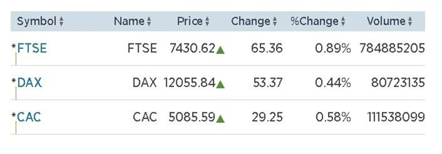Celoevropský index STOXX Europe 600 si připsal 0,86 %, britský FTSE 100 zpevnil o 0,89 %, německý DAX si připsal 0,44 % a francouzský CAC 40 si polepšil o 0,58 %.
