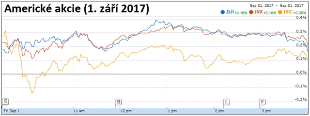 Posílily například akcie velkých automobilek, a to díky údajům o prodejích za srpen, který byl vyšší, než se čekalo. Automobilky také zveřejnily optimistický výhled, protože čekají, že obyvatelé oblasti Houstonu budou po hurikánu Harvey kupovat nová auta.
