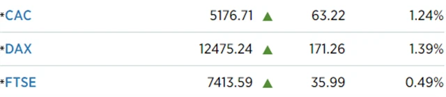 Regionální index STOXX Europe 600 si polepšil o 1,04 % na 379,19 bodu, britský FTSE 100 získal 0,49 % na 7 413,59 bodu, francouzský CAC 40 vzrostl o 1,24 % a německý benchmark DAX zpevnil o 1,39 % na 12 475,24 bodu.