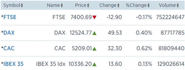 Regionální index STOXX Europe 600 stoupl o 0,52 % na 381,42 bodu, britský FTSE 100 šel proti trendu, když odepsal 0,17 %, francouzský CAC 40 získal 0,62 % na 5 209,01 bodu a německý DAX zpevnil o 0,4 % na 12 524,77 bodu.