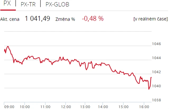 V červených číslech naopak obchodování zakončili Erste Group Bank (-1,79 % na 936,50 Kč), MONETA Money Bank (-0,63 % na 78,50 Kč), telefonní operátor O2 Czech Republic (-0,54 % na 274 Kč), textilka Pegas Nonwovens (-0,4 % na 1 002 Kč), petrochemický holding Unipetrol (-1,57 % na 339,10 Kč) a pojišťovna VIG (-0,3 % na 638,90 Kč).
