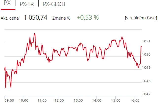 Pražská burza v pondělí navázala na zisk z minulého týdne, index PX zpevnil o 0,53 % na 1 050,74 bodu. Nahoru trh táhly akcie finančních titulů, nedařilo se naopak textilce Pegas Nonwovens a energetické skupině ČEZ. Objem obchodů byl s necelými 500 miliony korun podprůměrný.