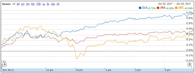 Americké akcie se v pondělí vyšplhaly na nová rekordní maxima. Podpořily je příznivé údaje o vývoji ekonomiky Spojených států, ze kterých těžil rovněž dolar. Euro se naopak dostalo pod tlak kvůli obavám z politických rizik v eurozóně, které posílilo nedělní referendum o nezávislosti Katalánska na Španělsku provázené násilnostmi.