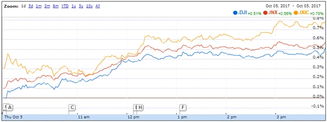 Index Dow si připsal 0,5 % a obchodování zakončil na novém zavíracím maximu 22 775,39 bodu, širší index S&P 500 stoupl o 0,56 % na nové zavírací maximum 2 552,07 bodu a index technologického trhu Nasdaq Composite se zvýšil o 0,78 % na nové zavírací maximum 6 585,36 bodu.