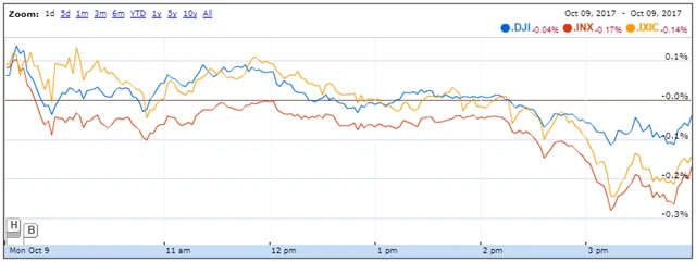 Index Dow ztratil 0,06 % a obchodování uzavřel na 22 761,07 bodu, širší S&P 500 klesl o 0,18 % na 2 544,73 bodu a index technologického trhu Nasdaq Composite se snížil o 0,16 % na 6 579,73 bodu. Index volatility VIX stoupl o 7,05 % na 10,33 bodu, dluhopisové trhy zůstaly v pondělí kvůli oslavám Dne Kryštofa Kolumba zavřené.