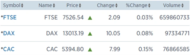 Regionální index STOXX Europe 600 odepsal 0,36 % na 389,33 bodu, britský FTSE 100 stoupl o 0,03 % na 7 526,54 bodu, francouzský CAC 40 zpevnil o 0,15 % na 5 394,8 bodu a německý DAX získal 0,08 % na 13 013,19 bodu. Nedařilo se zejména sektoru zdravotní péče, který klesl o více než procento.