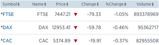 Regionální index STOXX Europe 600 odepsal 0,57 % na 387,13 bodu, britský FTSE 100 ztratil 1,05 % na 7 447,21 bodu, francouzský CAC 40 přišel o 0,37 % na 5 374,89 bodu a německý DAX odevzdal 0,46 % na 12 953,41 bodu.
