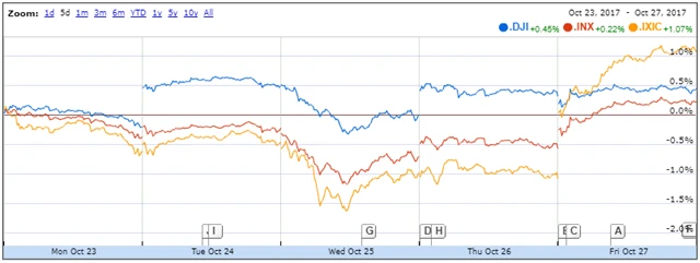 Dařilo se technologickému sektoru, jehož dílčí index v rámci benchmarku S&P 500 vyskočil dokonce o téměř 2,7 %. Technologické tituly se nahoru vydaly po sérii příznivých hospodářských výsledků zveřejněných po konci čtvrtečního obchodování - čísla reportovaly mimo jiné podniky Alphabet (+4,26 %), Amazon (+13,22 %), Microsoft (+6,41 %) nebo Intel (+7,38 %), jehož akcie v pátek uzavřely na 17letém maximu. Údajně velký zájem o telefon iPhone X pomohl také akciím Applu (+3,58 %).