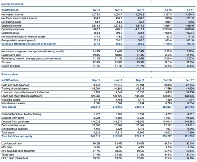 Erste Group Bank - vybrané ukazatele (3Q2017), zdroj: Erste