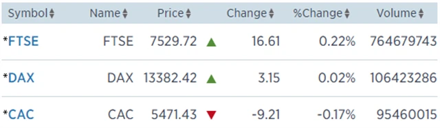 Regionální index STOXX Europe 600 odepsal 0,05 % na 394,45 bodu, britský FTSE 100 získal 0,22 % na 7 529,72 bodu, francouzský CAC 40 přišel o 0,17 % na 5 471,43 bodu a německý DAX vzrostl o 0,02 % na 13 382,42 bodu.