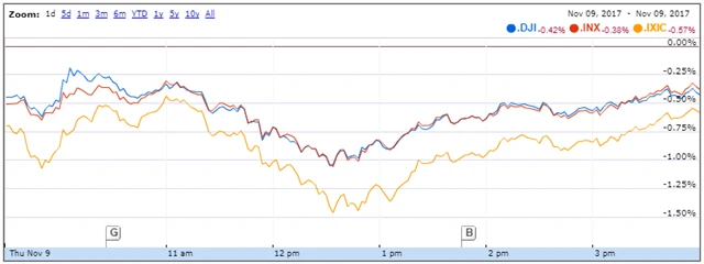 Americké akcie ve čtvrtek oslabily, trh ovládla nejistota před zveřejněním návrhu daňové reformy od republikánů v Senátu. Dolů zamířily akcie z technologického sektoru a průmyslového odvětví.