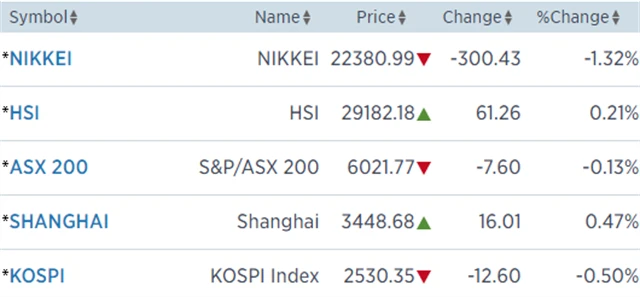 Japonský Nikkei 225 spadl o 1,32 % na nejnižší hodnotu od konce října. Dolů jej stáhly sektory financí a technologií, smíšeně uzavřely firmy z odvětví energetiky. Jihokorejský Kospi přišel o 0,5 %, přestože se dařilo tamním automobilkám. O 3,88 % vyletěly vzhůru akcie společnosti Hyundai Motor.
