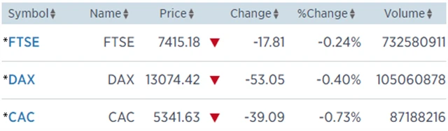 Regionální index STOXX Europe 600 odepsal 0,66 % na 386,13 bodu, britský FTSE 100 klesl o 0,24 % na 7 415,18 bodu, francouzský CAC 40 přišel o 0,73 % na 5 341,63 bodu a německý DAX odevzdal 0,4 % na 13 074,42 bodu. Proti trendu šly švýcarské akcie, jejichž index SMI zpevnil o 0,31 %.