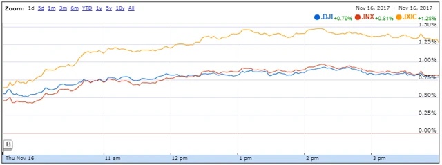 Index Dow přidal 0,8 % na 23 458,36 bodu, širší S&P 500 se zvýšil o 0,82 % na 2 585,64 bodu a index technologického trhu Nasdaq Composite den zakončil s přírůstkem 0,13 % na novém zavíracím maximu 6 793,29 bodu (absolutní rekord posunul na 6 806,67 bodu). Index volatility VIX spadl o 10,43 % na 11,76 bodu a výnos 10letých vládních dluhopisů USA se zvýšil o zhruba pět bazických bodů na 2,374 %.