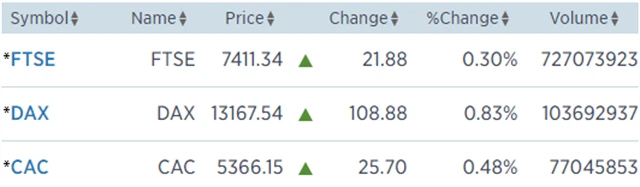 Regionální index STOXX Europe 600 získal 0,44 % na 388,1 bodu, britský FTSE 100 vzrostl o 0,3 % na 7 411,34 bodu, francouzský CAC 40 zpevnil o 0,48 % na 5 366,15 bodu a německý DAX si polepšil o 0,83 % na 13 167,54 bodu.