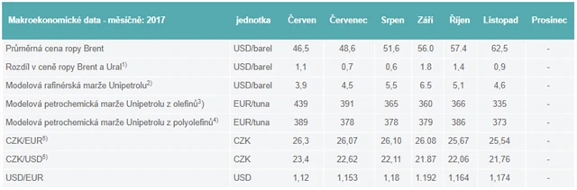 Petrochemický holding Unipetrol zveřejnil modelové marže za listopad. V rafinérském segmentu se marže snížila z 5,1 USD na barel v říjnu na 4,6 USD. Rozdíl mezi cenami ropy Brent a Ural klesl z 1,4 USD na 0,9 USD na barel. Olefinová marže dosáhla 335 eur na tunu (říjen: 366 eur) a polyolefinová marže byla 373 eur na tunu (říjen: 386 eur).