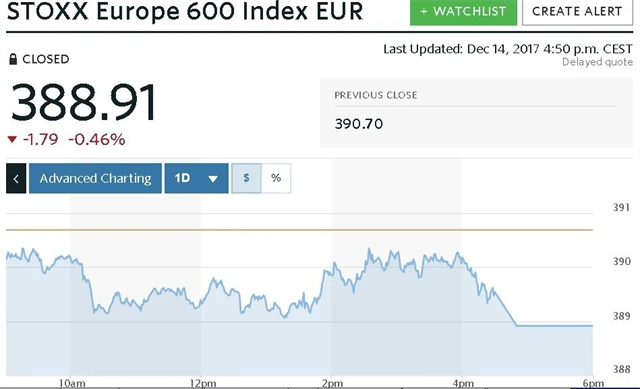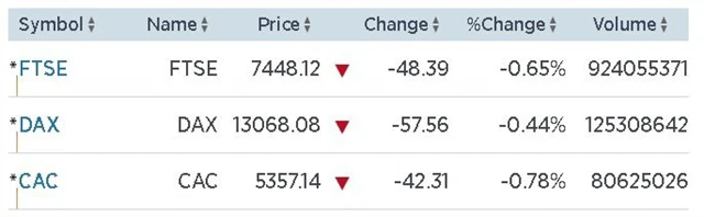 Celoevropský akciový index STOXX Europe 600 uzavřel se ztrátou 0,46 %, přičemž dolů zamířila většina odvětví. Jednotlivé akciové burzy si vedly podobně, hlavní index londýnské burzy FTSE 100 klesl o 0,65 %, německý DAX si pohoršil o 0,44 % a francouzský CAC 40 ztratil 0,78 %.