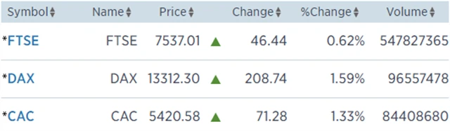 Regionální index STOXX Europe 600 stoupl o 1,15 % na 392,66 bodu, britský FTSE 100 získal 0,62 % na 7 537,01 bodu, CAC 40 zpevnil o 1,33 % na 5 420,58 bodu a německý DAX vzrostl o 1,59 % na 13 312,3 bodu.