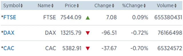 Regionální index STOXX Europe 600 klesl o 0,42 % na 391,02 bodu, britský FTSE 100 získal 0,09 % na 7 544,09 bodu, francouzský CAC 40 odevzdal 0,7 % na 5 382,91 bodu a německý DAX přišel o 0,72 % na 13 215,79 bodu.