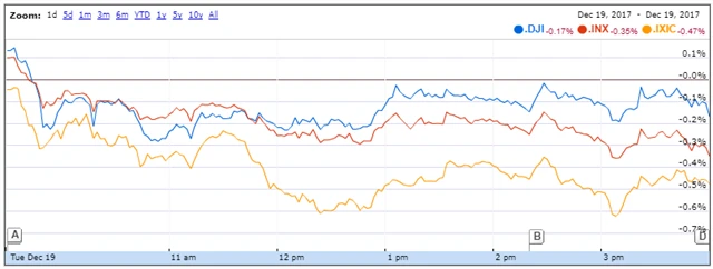 Americké akcie v úterý oslabily. Nad původním nadšením z pravděpodobného přijetí daňové reformy převážily obavy z toho, jaký bude mít reforma dopad na další vývoj úrokových sazeb. V posledních týdnech akcie v naději na snížení daní, které by mohlo zvýšit zisky amerických firem a podpořit ekonomiku USA, posilovaly.