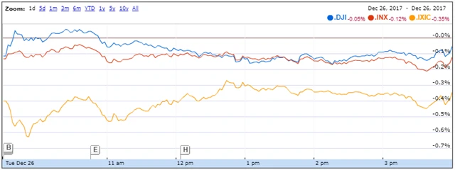 Americké akcie v úterý po vánočních svátcích mírně klesly, nejslabší výkon podaly technologické tituly.