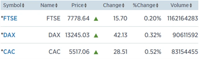 Regionální index STOXX Europe 600 vzrostl o 0,31 % na 398,49 bodu, za celý týden pak získal 0,29 %. Britský FTSE 100 zpevnil o 0,2 % na 7 778,64 bodu (za celý týden +0,71 %), francouzský CAC 40 stoupl o 0,52 % na 5 517,06 bodu (za celý týden +0,85 %) a německý DAX si polepšil o 0,32 % na 13 245,03 bodu (za celý týden -0,56 %).