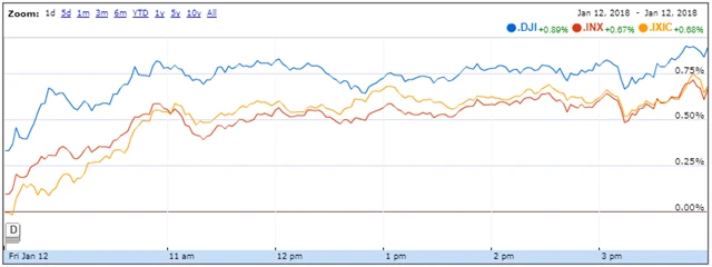 Index Dow si připsal 0,89 % na nové zavírací maximum 25 803,19 bodu, širší S&P 500 vzrostl o 0,67 % na 2 786,24 bodu a index technologického trhu Nasdaq Composite se zvýšil o 0,68 % na 7 261,06 bodu. Všechny tři indexy posunuly výše i svá absolutní maxima - Dow na 25 810,43 bodu, S&P 500 na 2 787,85 bodu a Nasdaq Composite na 7 265,26 bodu.