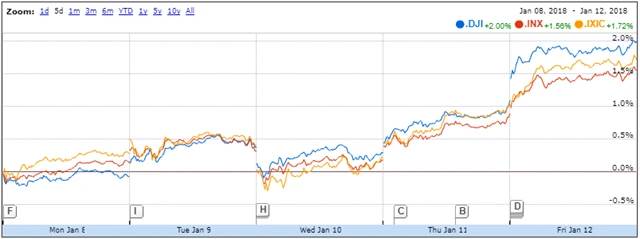 Za celý uplynulý týden si Dow připsal 2,01 %, S&P 500 vzrostl o 1,57 % a Nasdaq Composite se zvýšil o 1,74 %.