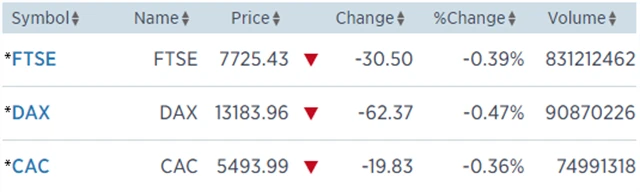 Regionální index STOXX Europe 600 odepsal 0,1 % na 397,97 bodu, britský FTSE 100 ztratil 0,39 % na 7 725,43 bodu, francouzský CAC 40 klesl o 0,36 % na 5 493,99 bodu a německý DAX odevzdal 0,47 % na 13 183,96 bodu.