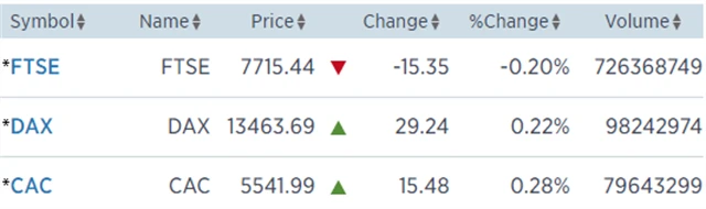 Regionální index STOXX Europe 600 zpevnil o 0,31 % na 402,11 bodu, britský FTSE 100 odepsal 0,2 % na 7 715,44 bodu, francouzský CAC 40 si polepšil o 0,28 % na 5 541,99 bodu a německý DAX vzrostl o 0,22 % na 13 463,69 bodu. Dařilo se zejména sektoru telekomunikací a také bankovním titulům.