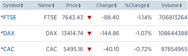Regionální index STOXX Europe 600 odepsal 0,5 % na 400,79 bodu, britský FTSE 100 ztratil 1,14 % na 7 643,43 bodu, francouzský CAC 40 klesl o 0,72 % na 5 495,16 bodu a německý DAX spadl o 1,07 % na 13 414,74 bodu.