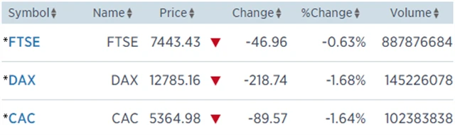 Regionální index STOXX Europe 600 odepsal 1,38 % na 388,07, za celý týden pak spadl o 3,12 %. Britský FTSE 100 klesl o 0,63 % na 7 443,43 bodu (za celý týden -2,9 %), francouzský CAC 40 ztratil 1,64 % na 5 364,98 bodu (za celý týden -2,9 %) a německý DAX odevzdal 1,68 % na 12 785,16 bodu (za celý týden -3,13 %).