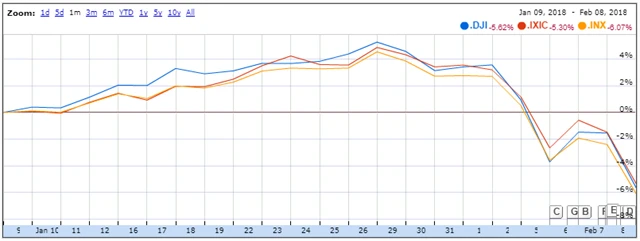 Dow a S&P 500 už ztratily více než 10 % ze svých rekordních maxim, na která se vyšplhaly 26. ledna. V pondělí se Dow propadl o 4,6 %, a utrpěl tak nejprudší procentní pokles od srpna 2011. V úterý se naopak zvýšil o 2,33 %, což představovalo nejprudší procentní nárůst od ledna 2016. Ve středu opět klesl, ale jen o necelou desetinu procenta.