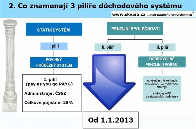 Důchodová reforma v České republice se dotkne prakticky každého z nás. Slovo "pilíř" se musejí naučit vyslovovat i ti, kteří ho dosud znali pouze jako nadužívané slovo televizních komentátorů ze spojení typu "pilíř obrany". Lidé se musejí rozhodnout, jak velkou část svého dosavadního sociálního, tedy důchodového pojištění přesunou do kterého pilíře penzijního systému. Ty mají být celkem tři: první povinný státní, druhý následně povinný v roce 2013 a třetí dobrovolný soukromý. "Výhodnost té které varianty závisí na věku, pohlaví, výši příjmu a investiční strategii zvolené ve druhém pilíři," vysvětluje finanční poradce Miroslav Škvára.