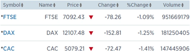 Regionální index STOXX Europe 600 ztratil 1,45 % na 368,61 bodu, za celý týden pak přišel o 5,01 %. Britský FTSE 100 odevzdal 1,09 % na 7 092,43 bodu (za celý týden -4,91 %), francouzský CAC 40 klesl o 1,41 % na 5 079,21 bodu (za celý týden -5,33 %) a německý DAX odepsal 1,25 % na 12 107,48 bodu (za celý týden -5,3 %).
