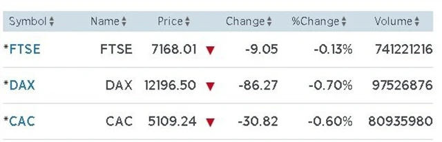 Celoevropský index STOXX Europe 600 zakončil obchodování se ztrátou 0,63 %. I jednotlivé burzy uzavřely převážně níže než v pondělí. Hlavní index londýnské burzy FTSE 100 se pohyboval kolem nuly, než v závěru uzavřel se ztrátou 0,13 %. Německý DAX klesl o 0,7 % a francouzský CAC 40 přišel o 0,6 %.