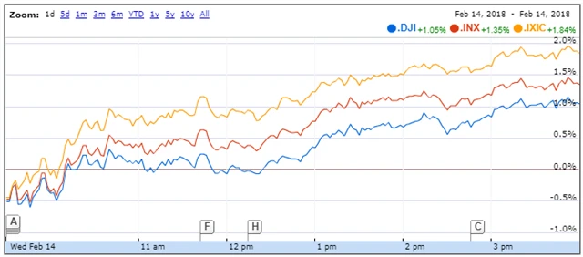 Index Dow stoupl o 1,03 % na 24 893,49 bodu, širší S&P 500 posílil o 1,34 % na 2 698,63 bodu a index technologického trhu Nasdaq Composite se zvýšil o 1,86 % na 7 143,62 bodu. Index volatility VIX spadl o 22,87 % na 19,26 bodu a výnos 10letých vládních dluhopisů USA se zvýšil o více než sedm bazických bodů na 2,902 %.