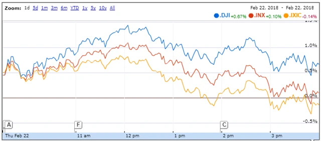 Index Dow posílil o 0,66 % na 24 962,48 bodu a širší S&P 500 stoupl o 0,1 % na 2 703,96 bodu, zatímco index technologického trhu Nasdaq Composite odepsal 0,11 % na 7 210,09 bodu. Index volatility VIX spadl o 6,49 % na 18,72 bodu a výnos 10letých vládních dluhopisů USA se snížil o zhruba tři bazické body na 2,921 %, a sestoupil tak z více než čtyřletého maxima, na které se dostal ve středu.