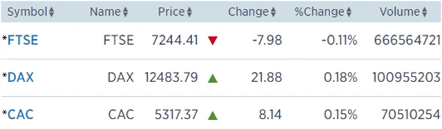 Regionální index STOXX Europe 600 si připsal 0,23 % na 381,22 bodu, za celý týden pak stoupl o 0,16 %. Britský FTSE 100 odepsal 0,11 % na 7 244,41 bodu (za celý týden -0,71 %), francouzský CAC 40 zpevnil o 0,15 % na 5 317,37 bodu (za celý týden +0,68 %) a německý DAX vzrostl o 0,18 % na 12 483,79 bodu (za celý týden +0,26 %).