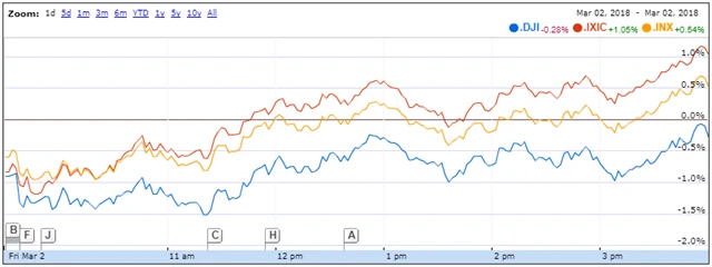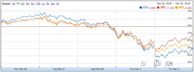 Ve čtvrtek akciové indexy výrazně klesly v reakci na oznámení amerického prezidenta Donalda Trumpa, že USA zavedou příští týden cla na dovoz oceli a hliníku. To vyvolalo obavy z růstu cen komodit a z obchodních válek. Na dovoz oceli má být zavedeno clo 25 % a na dovoz hliníku 10 %.