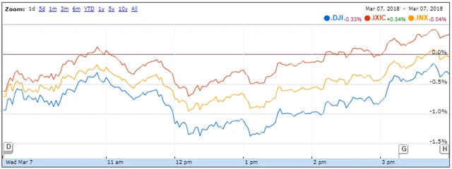 Americké akcie zakončily středeční obchodní seanci s mírnými ztrátami, posílil jen index technologického trhu Nasdaq Composite. Nervozitu na trhu vyvolala zpráva o odchodu hlavního ekonomického poradce prezidenta Donalda Trumpa z funkce.