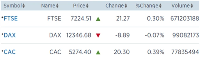 Regionální index STOXX Europe 600 vzrostl o 0,43 % na 378,24 bodu, za celý týden si pak připsal 3,05 %. Britský FTSE 100 získal 0,3 % na 7 224,51 bodu (za celý týden +2,11 %), francouzský CAC 40 zpevnil o 0,39 % na 5 274,4 bodu (za celý týden +2,58 %) a německý DAX přišel o 0,07 % na 12 346,68 bodu (za celý týden +3,63 %).
