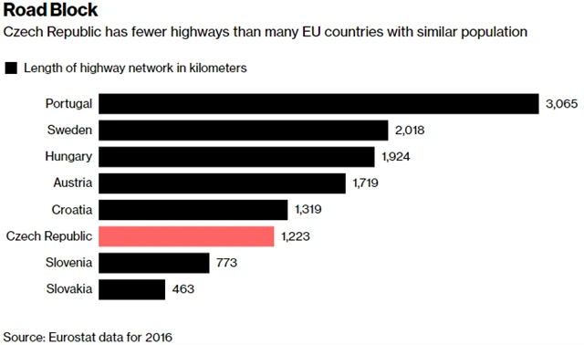 Česku se v posledních letech ekonomicky daří, což naznačuje například nejnižší nezaměstnanost v EU či více než 5% růst české ekonomiky ve čtvrtém čtvrtletí loňského roku, za ostatními evropskými zeměmi, a to i za těmi chudšími, však země zaostává v rychlosti cestování, v počtu dálničních kilometrů je Česko totiž jednou z nejhorších zemí v EU, napsala agentura Bloomberg.