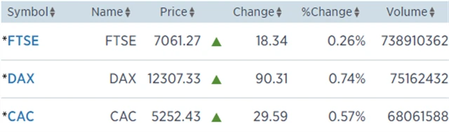 Regionální index STOXX Europe 600 stoupl o 0,58 % na 375,83 bodu, britský FTSE 100 získal 0,26 % na 7 061,27 bodu, francouzský CAC 40 vzrostl o 0,57 % na 5 252,43 bodu a německý DAX si připsal 0,74 % na 12 307,23 bodu.
