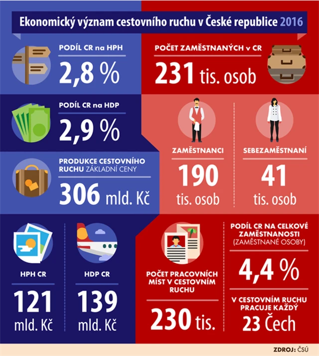 V roce 2016 se cestovní ruch podílel třemi procenty na hrubém domácím produktu ČR. S rostoucím počtem zahraničních i domácích návštěvníků se zvyšuje význam cestovního ruchu pro české hospodářství. Hrubá přidaná hodnota v sektoru přesáhla 120 miliard korun. O její růst se zasloužily především služby ubytovacích zařízení, pohostinství, osobní doprava, cestovní kanceláře, kulturní, sportovní a jiné rekreační služby.