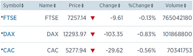 Regionální index STOXX Europe 600 odepsal 0,59 % na 376,17 bodu, britský FTSE 100 klesl o 0,13 % na 7 257,14 bodu, francouzský CAC 40 ztratil 0,56 % na 5 277,94 bodu a německý DAX odevzdal 0,83 % na 12 293,97 bodu.