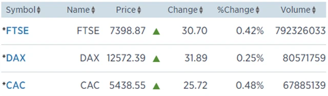 Regionální index STOXX Europe 600 zpevnil o 0,37 % na 383,27 bodu, britský FTSE 100 si polepšil o 0,42 % na 7 398,87 bodu, francouzský CAC 40 získal 0,48 % na 5 438,55 bodu a německý DAX stoupl o 0,25 % na 12 572,39 bodu.