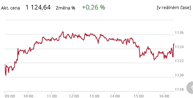 Nejvíce obchodované akcie ČEZ přidaly 1,12 % na 542 korun. Energetická společnost krátce před koncem obchodního dne ohlásila, že navrhuje z loňského zisku vyplatit dividendu v hrubé výši 33 korun na akcii.
