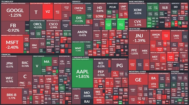 Index Dow se v pondělí snížil o 0,6 % na 24 163,15 bodu, širší S&P 500 se snížil o 0,82 % na 2 648,05 bodu a index technologického trhu Nasdaq Composite klesl o 0,75 % na 7 066,27 bodu. Index volatility VIX stoupl o 3,37 % na 15,93 bodu a výnos 10letých vládních dluhopisů USA setrval na 2,95 %.